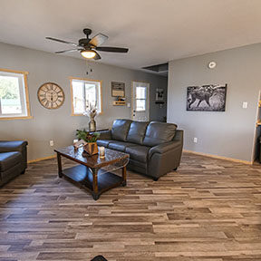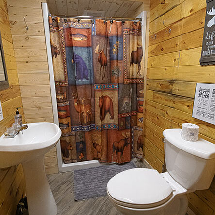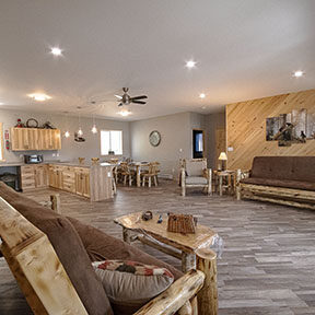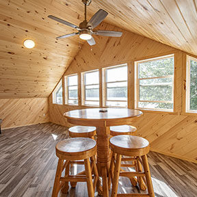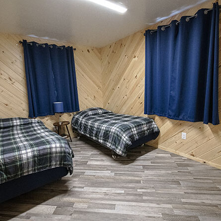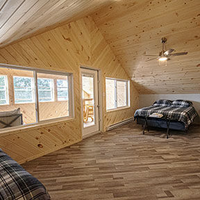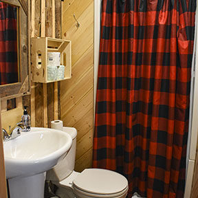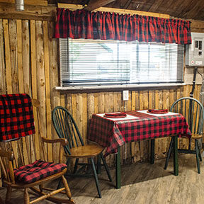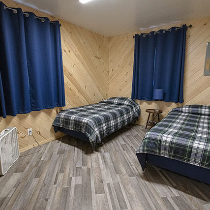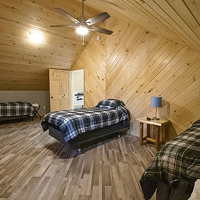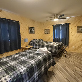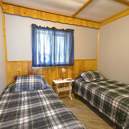 Whispering Pines has two bedrooms and sleeps six in a double and 4 singles. This cabin is wheelchair accessible.